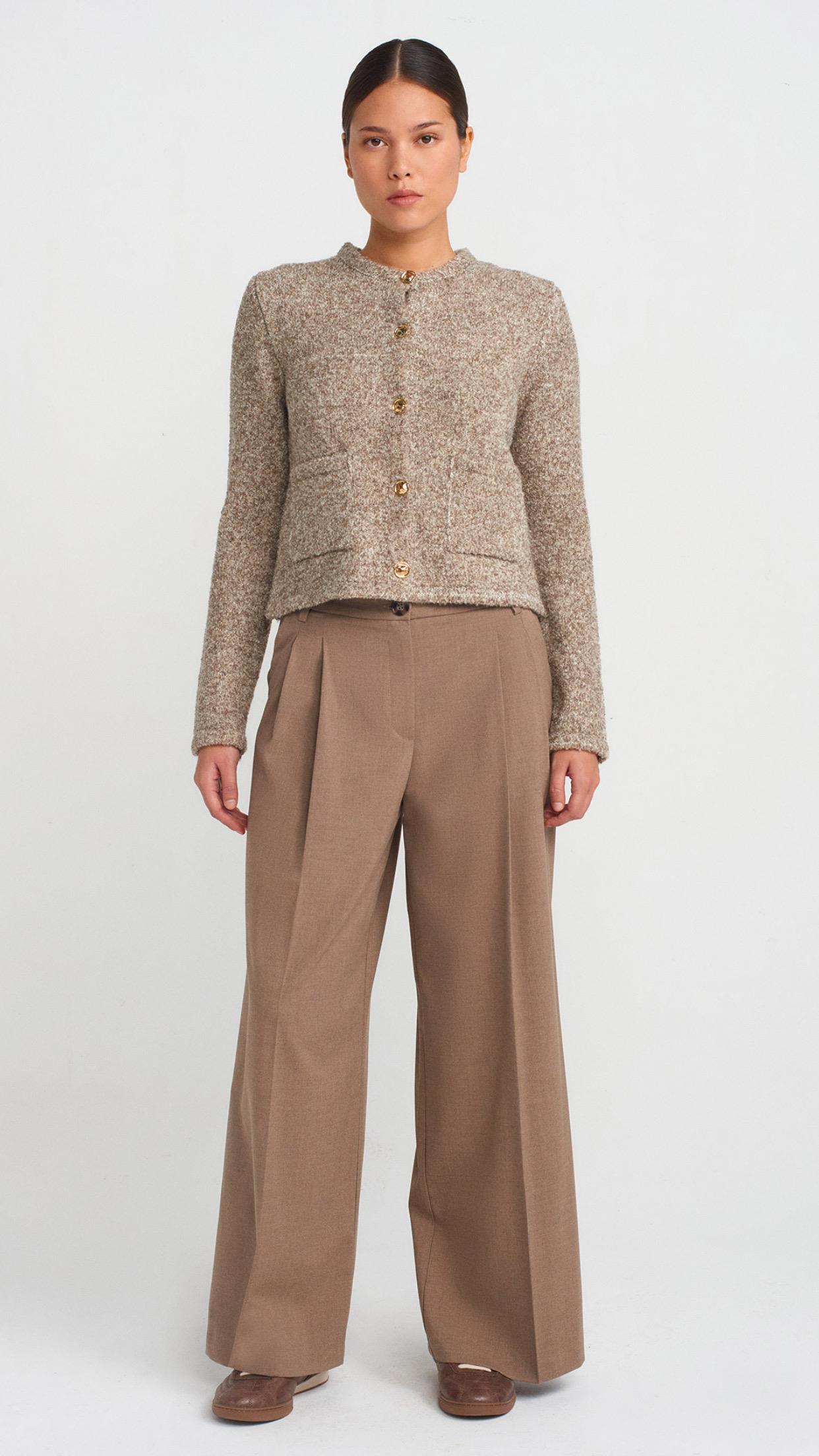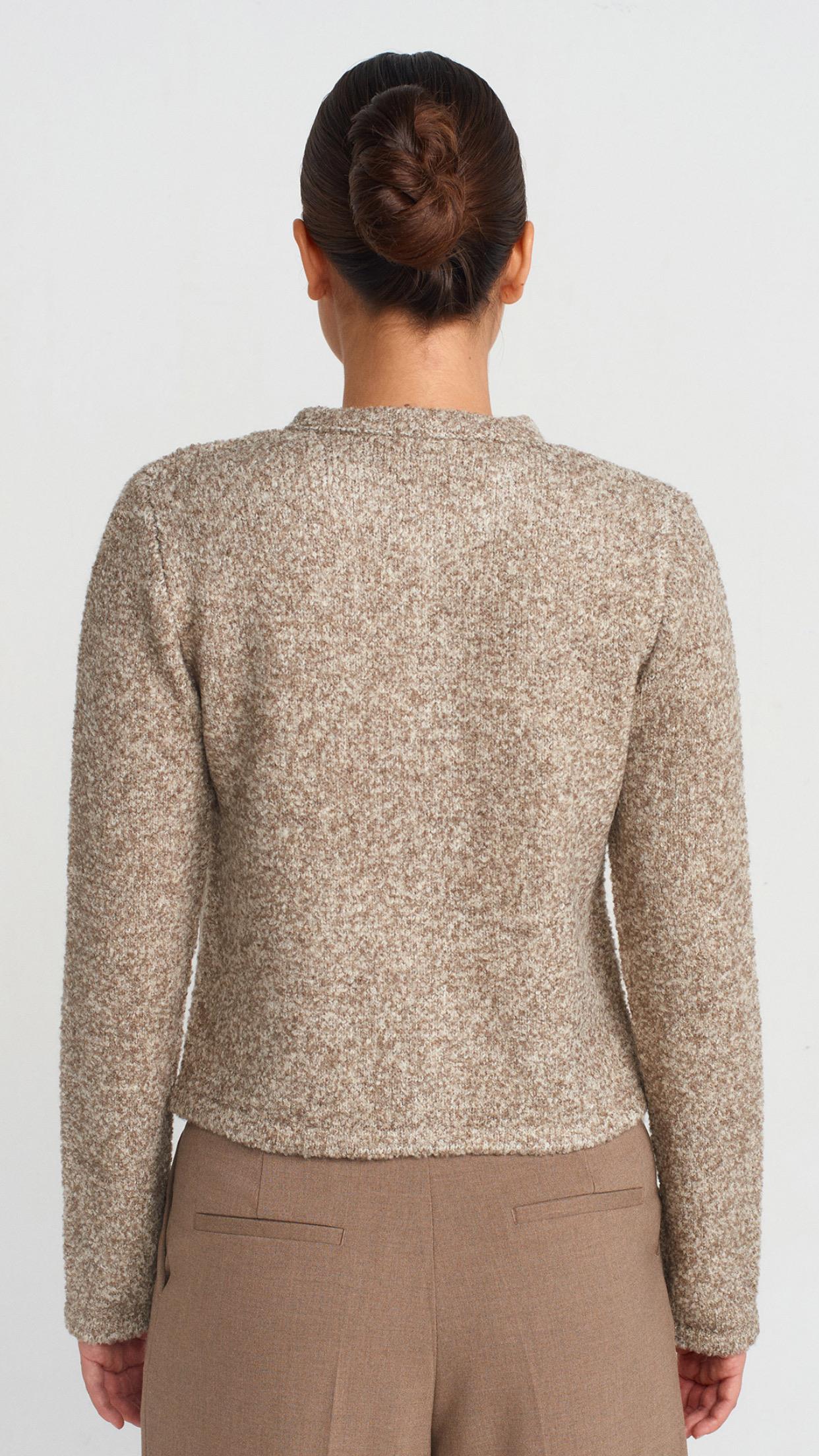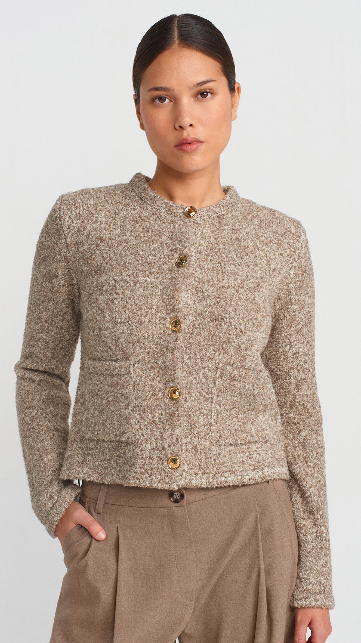 Bisiklet Yaka Buklet Cepli Düğmeli Triko Hırka-Vizon (60923)
