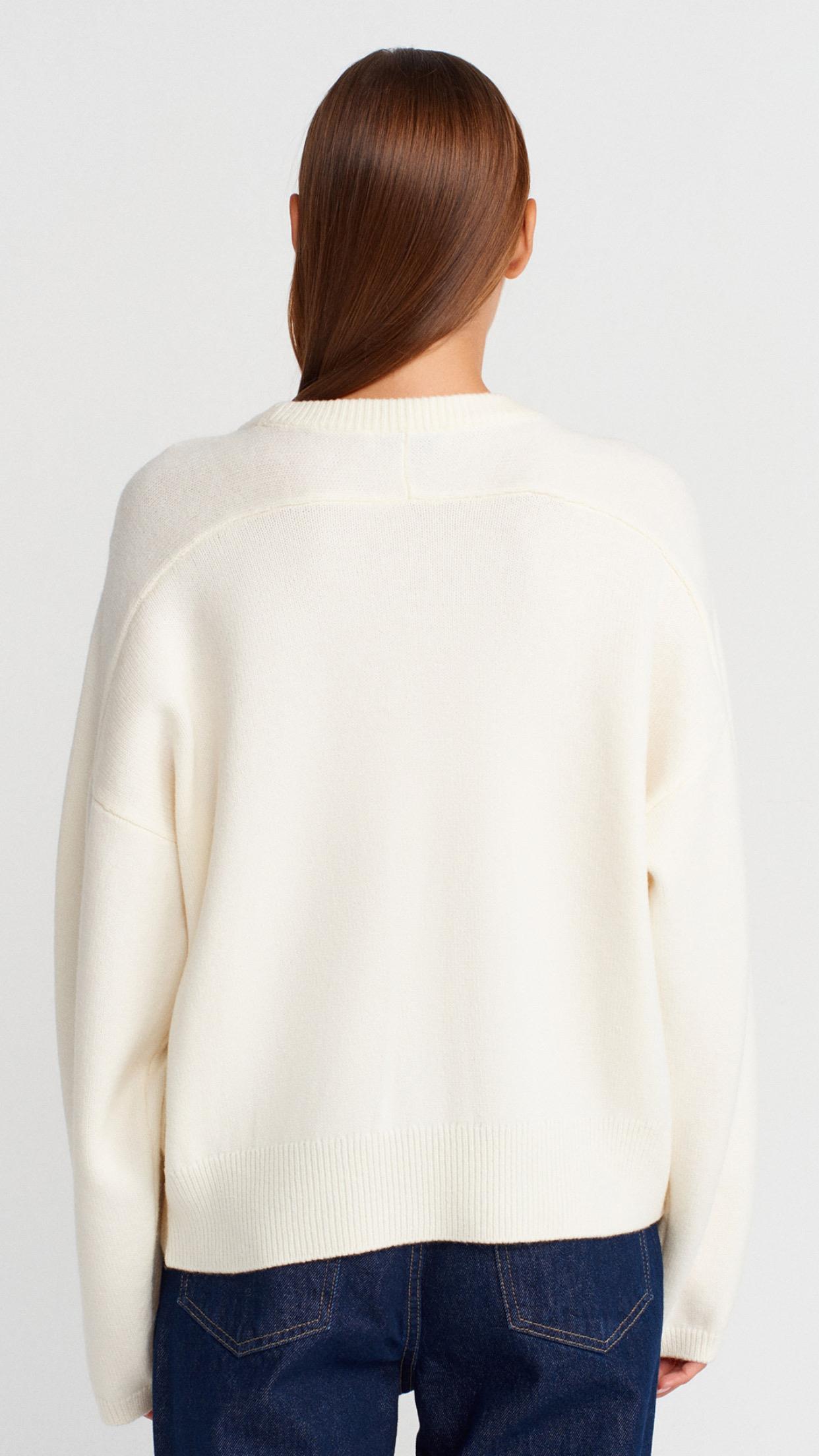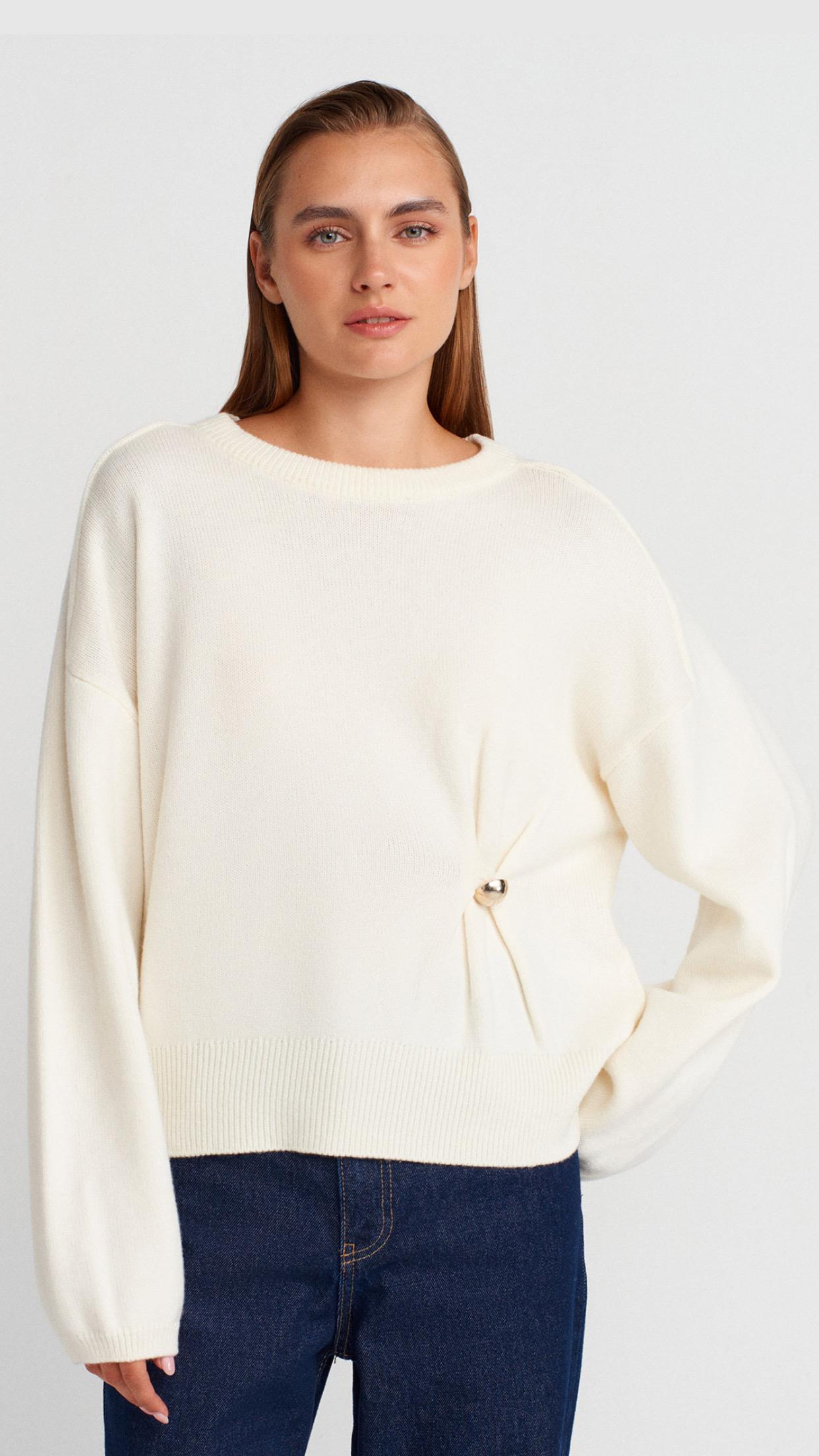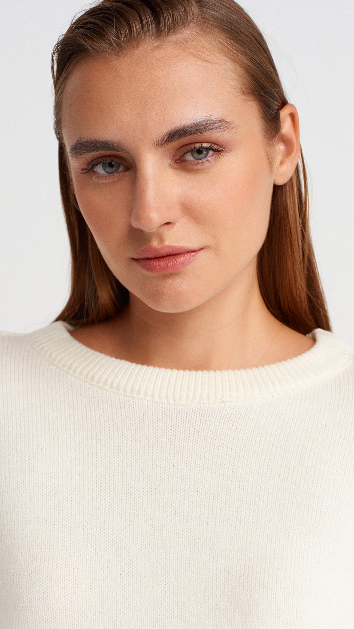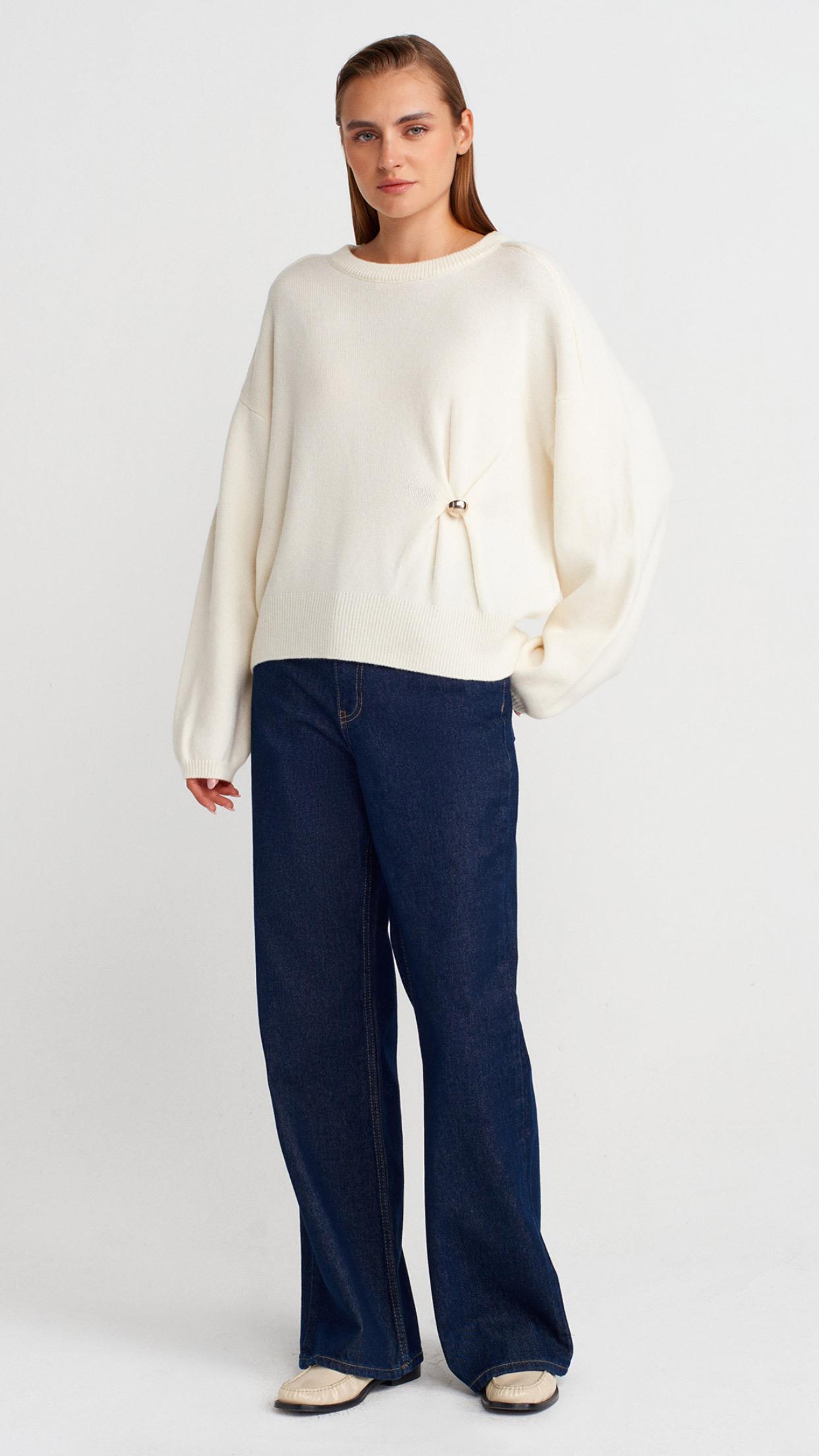 Bisiklet Yaka Büzgü Düğme Detaylı Yünlü Triko Kazak-Ekru (10812)
