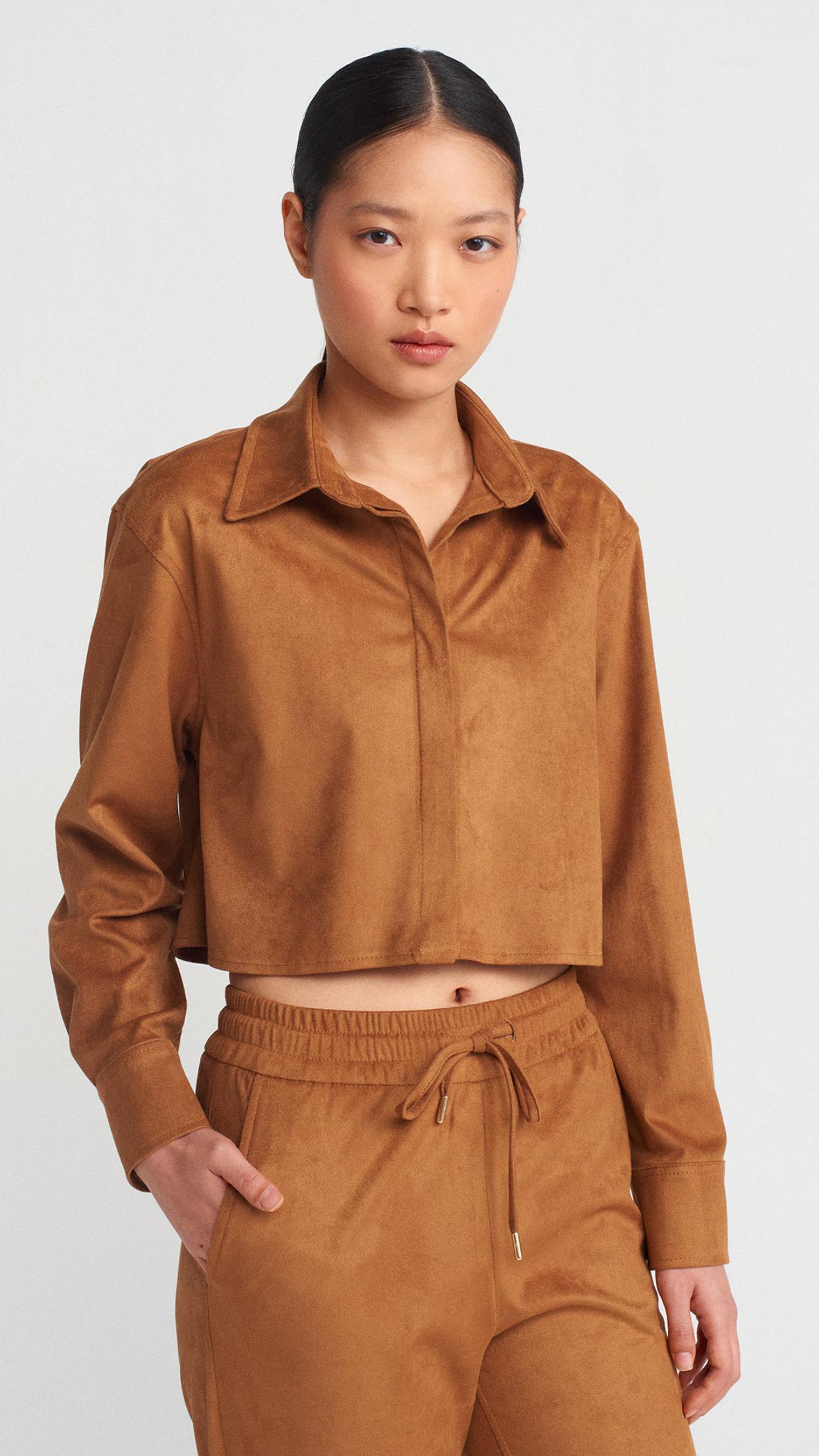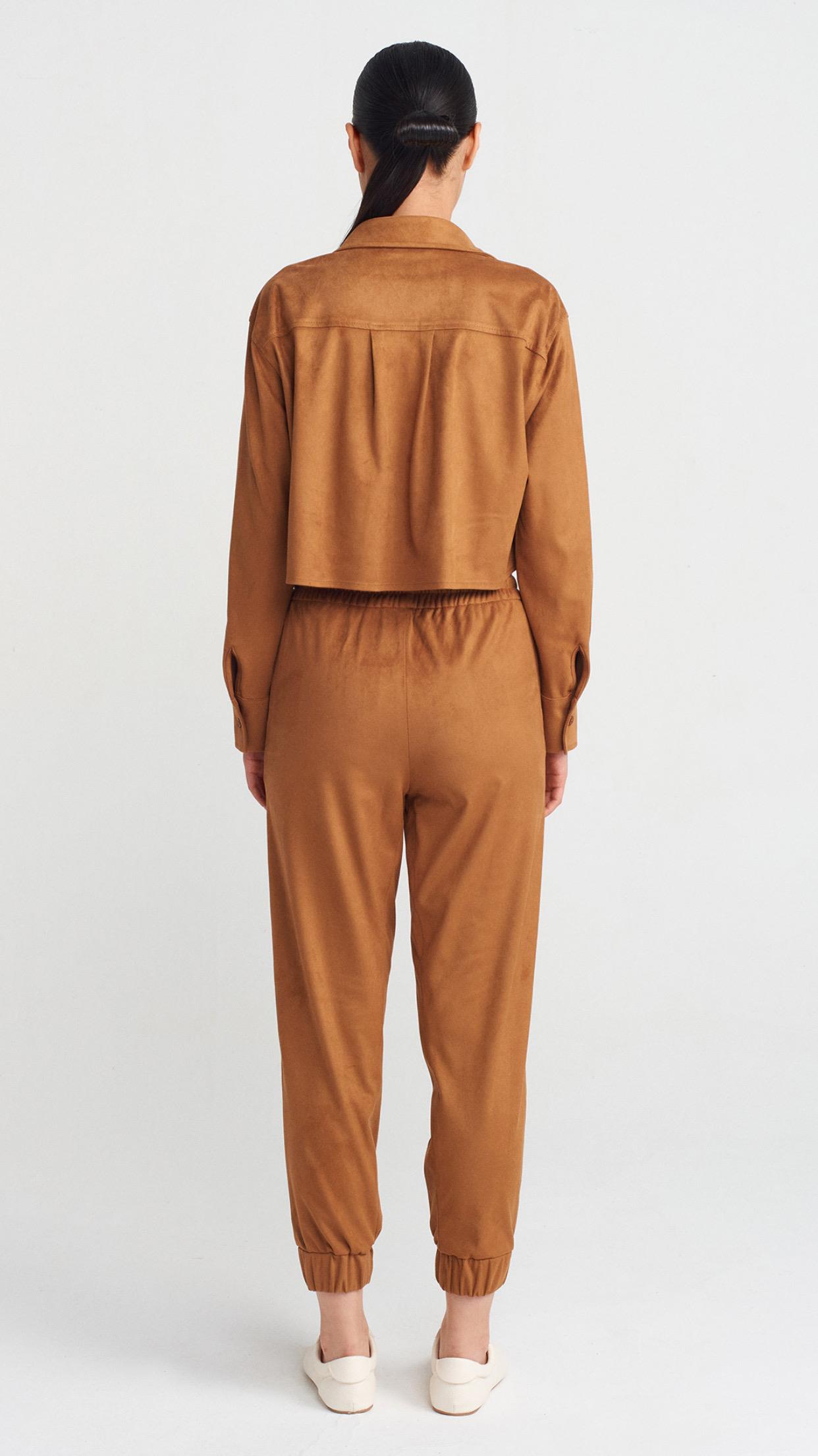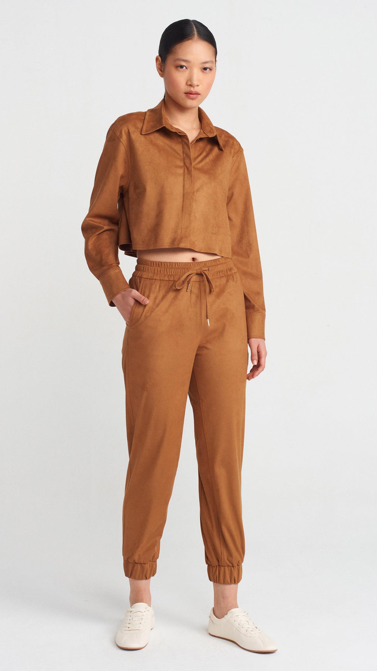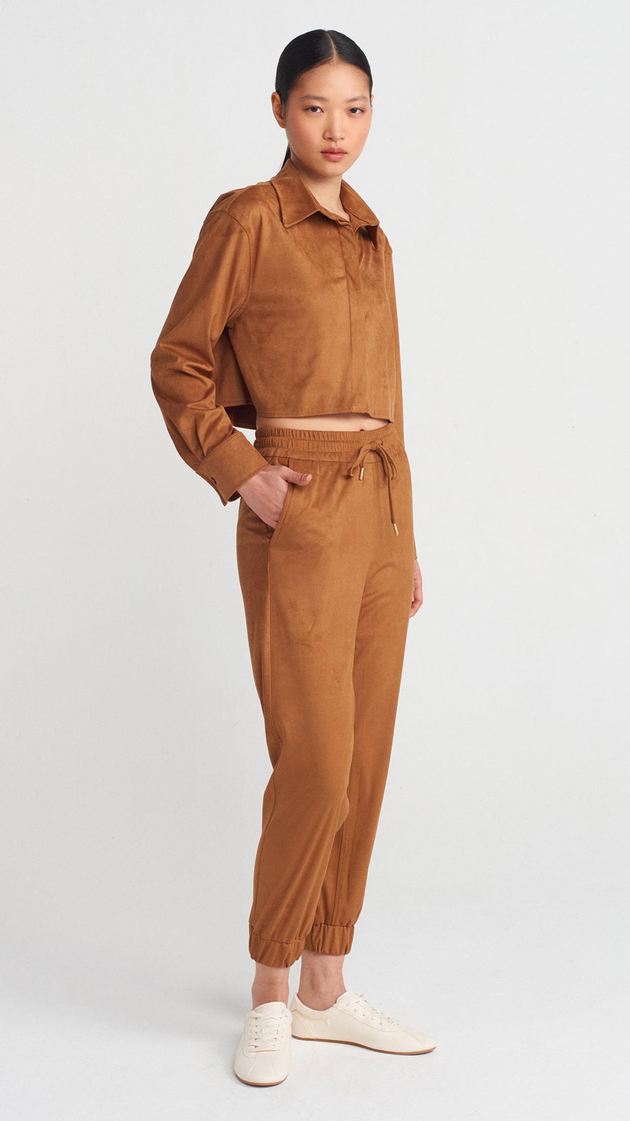 Dökümlü Crop Gömlek Manşetli Joggeer Süet Takım-Taba (50493)
